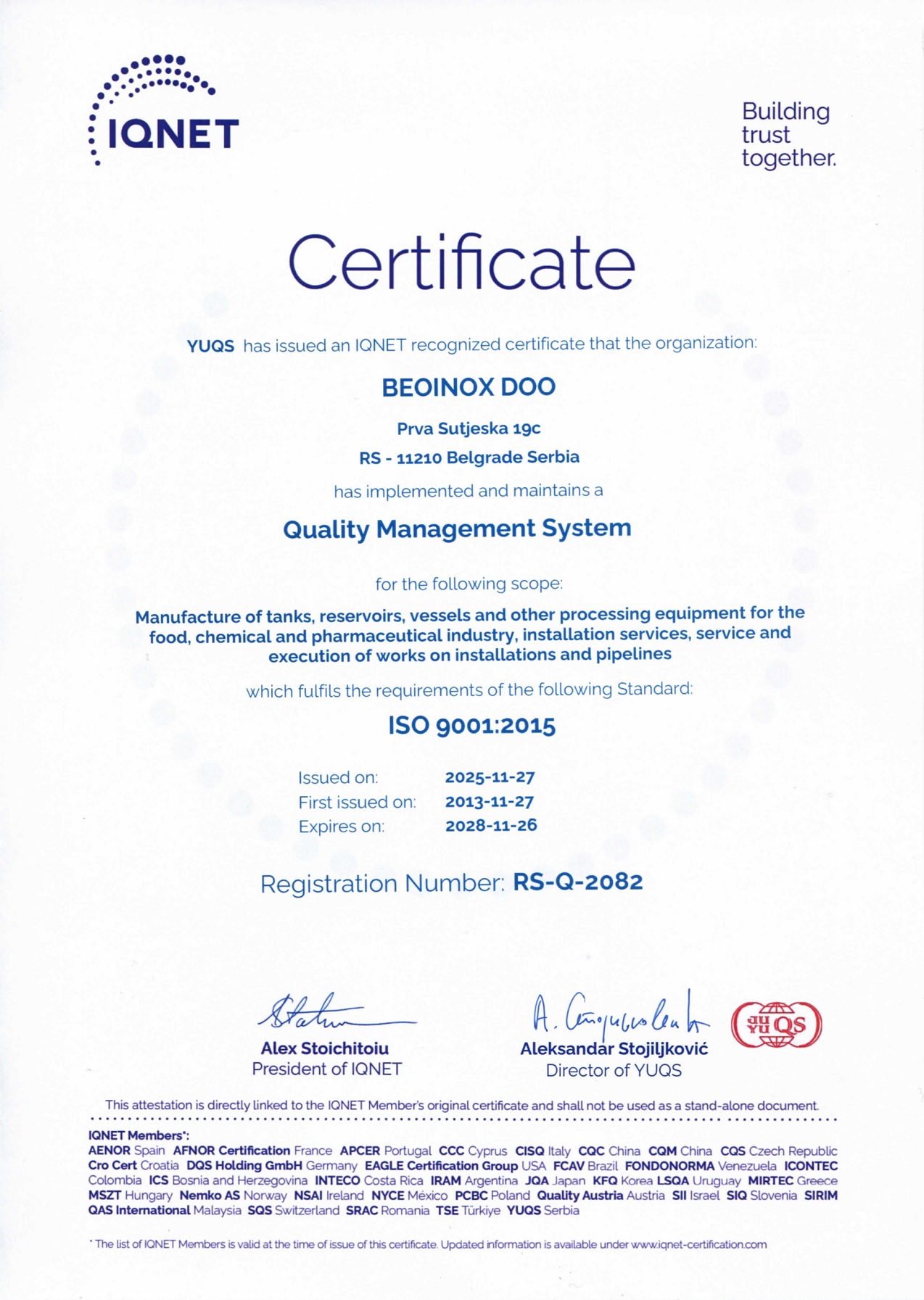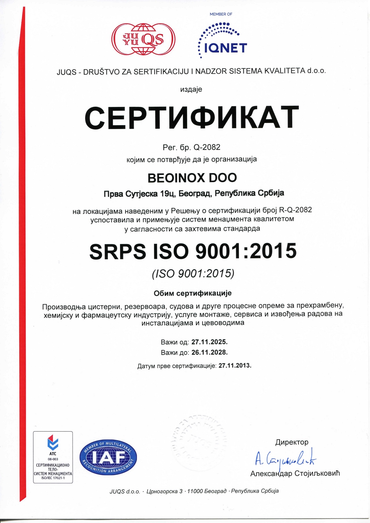 - Svi naši proizvodi su atestirani i zadovoljavaju nacionalne i internacionalne standarde. "BEOINOX" je sertifikovan za rad u Poslovnom sistemu kvaliteta ISO 9001:2015.